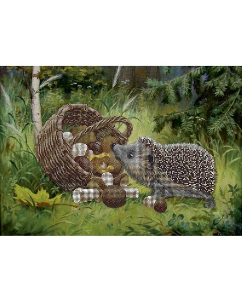 "Ежик в лесу , А3-К-138 Количество цветов бисера -14. Размер - А3 Материал - габардин подклеенный флизелином. Предлагаем подбор бисера.