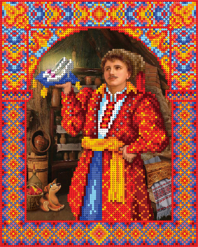 Ткань c нанесенным полноцветным рисунком; схема, представлена в виде цветных значков и нанесена на ткань поверх изображения; бисер пр-ва Чехия (16 цветов, 1 вид бусин); бисерная игла; инструкция. Размер: 20,0 х 25,0 см