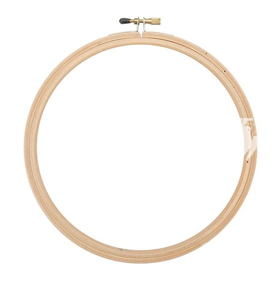Круглые пяльцы для вышивания с регулировочным винтовым зажимом.